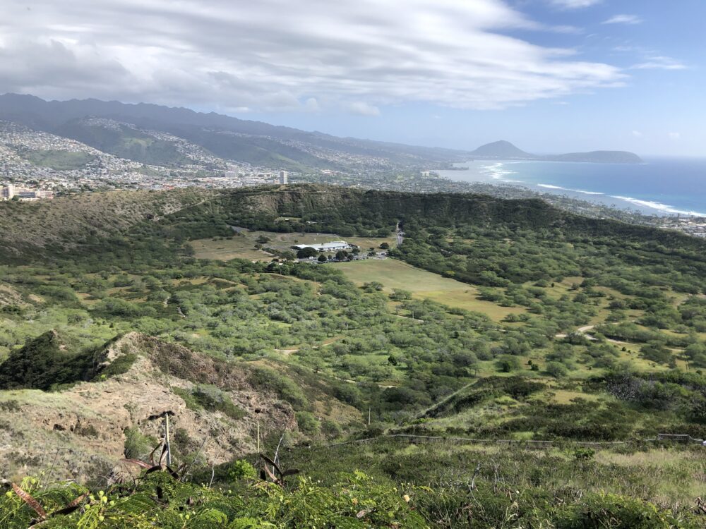 ダイヤモンドヘッドは、ハワイ・オアフ島にある火山で、約30万年前の噴火によって形成された火山砕屑丘(タフコーン)です 。標高は232メートル、火口の広さは約1.4平方キロメートルで、現在は休火山となっています。こちらは登山道の途中で撮ったダイヤモンドヘッドの内側の写真です。全体が丸いクレーターになっていることがよくわかります。